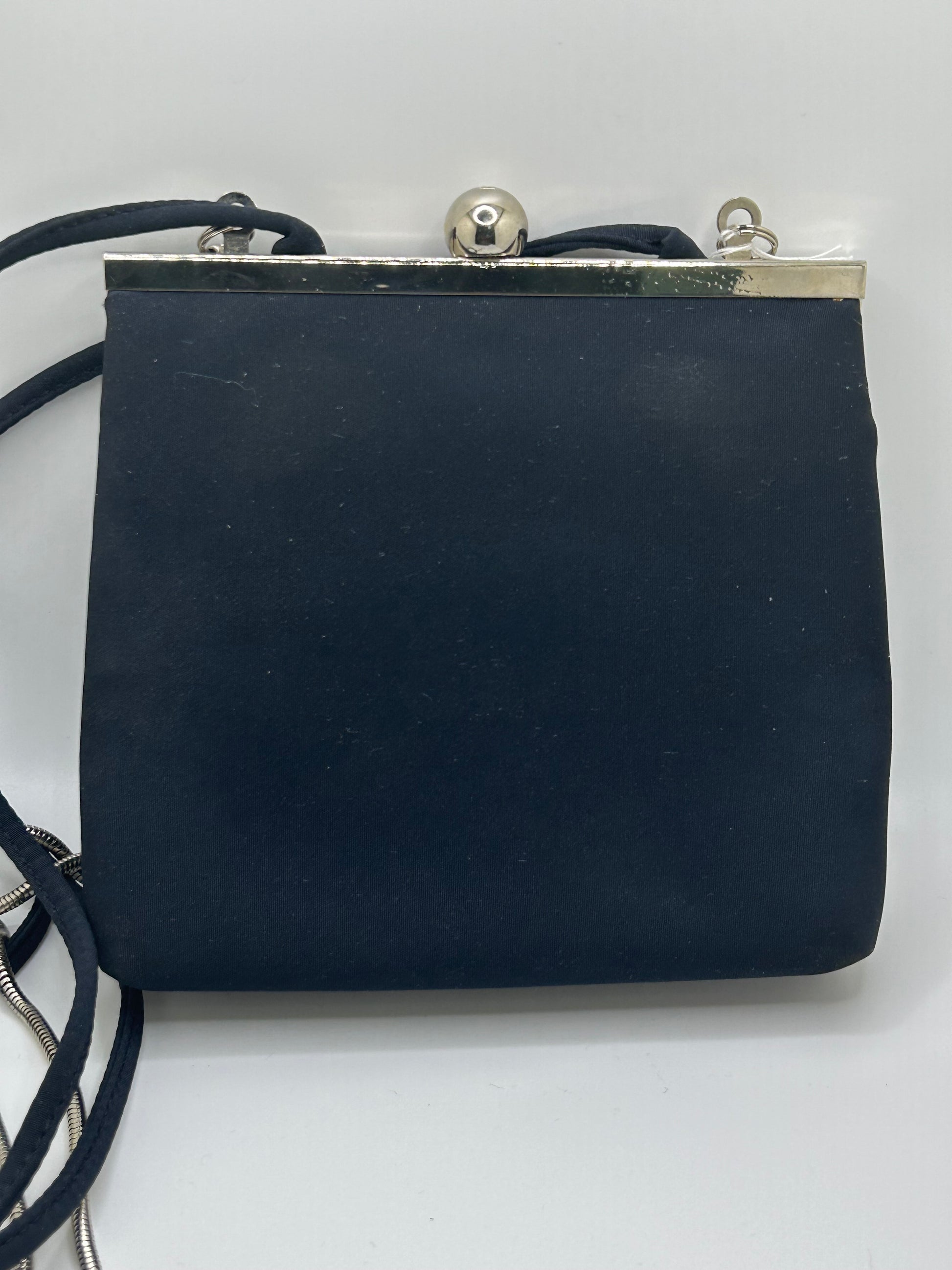 Mini small black Liz Claiborne cloth bag with silver clasp. In good condition with 1 crossbody cloth strap and 1 detachable silver chain strap. Please see photos.