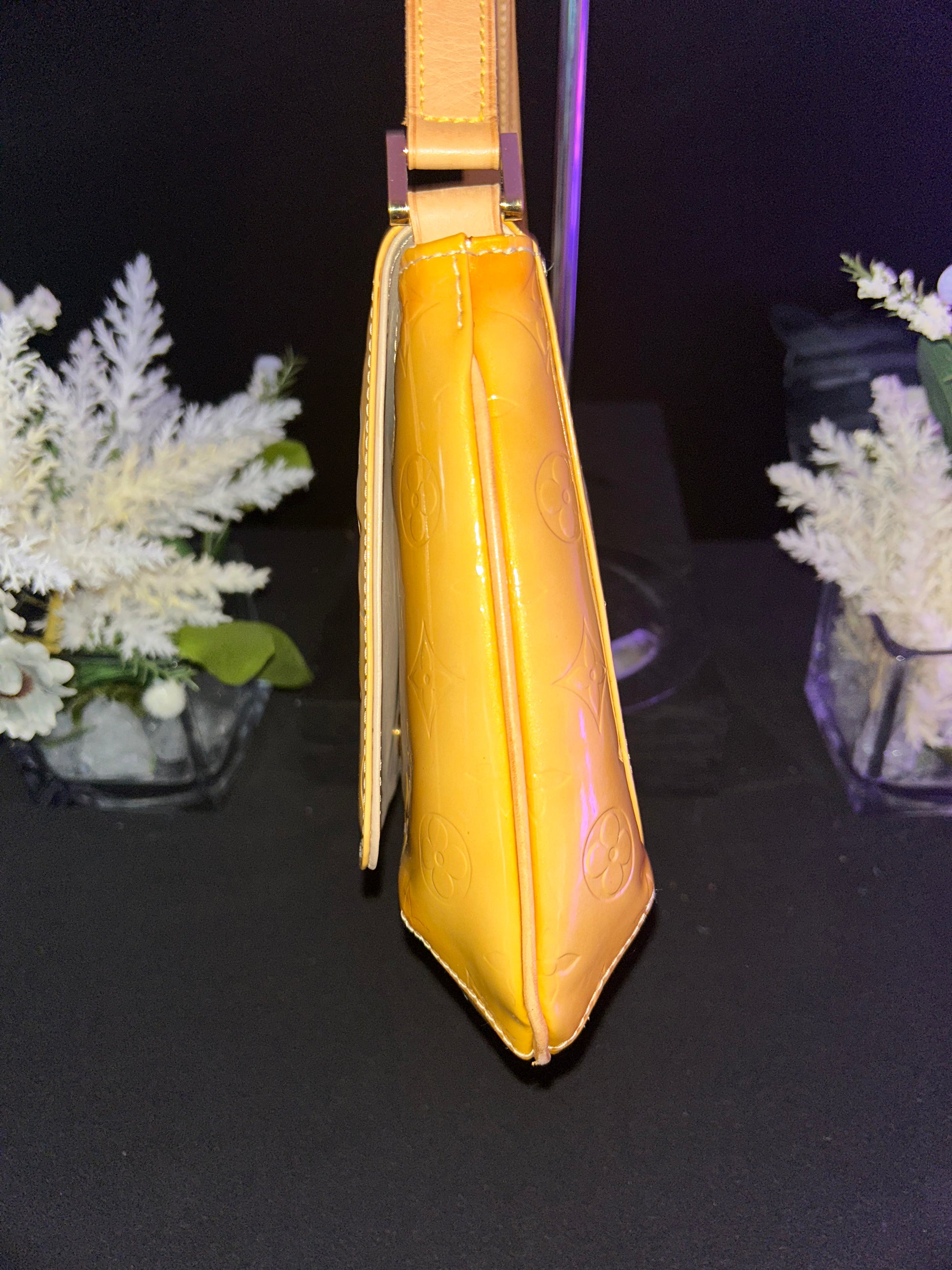Authentic pre loved Louis Vuitton monogrammed Vernis bag. In excellent condition with minimal signs of wear. Size 10.2” L x 7.9” H x 2” D. Vachetta leather adjustable strap in great condition, strap drop 9.4-11.8 inches. Gold plated hardware still shines with no significant signs of wear. Serial # MI0020