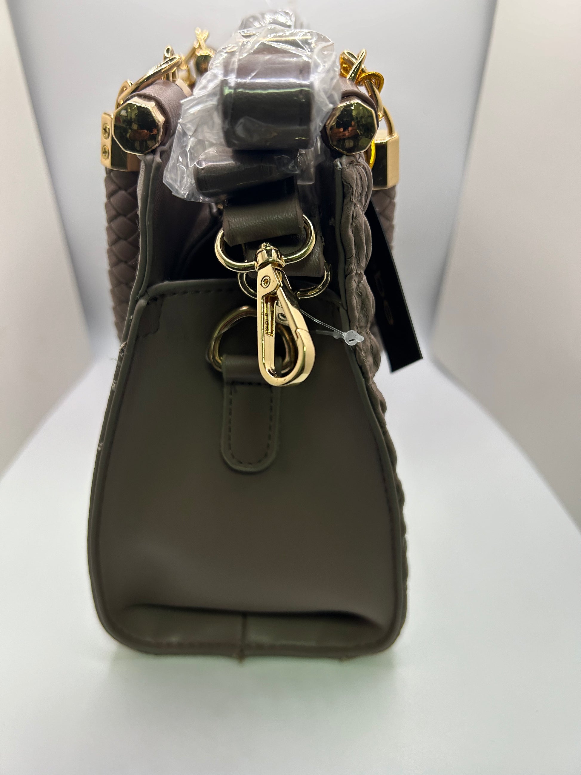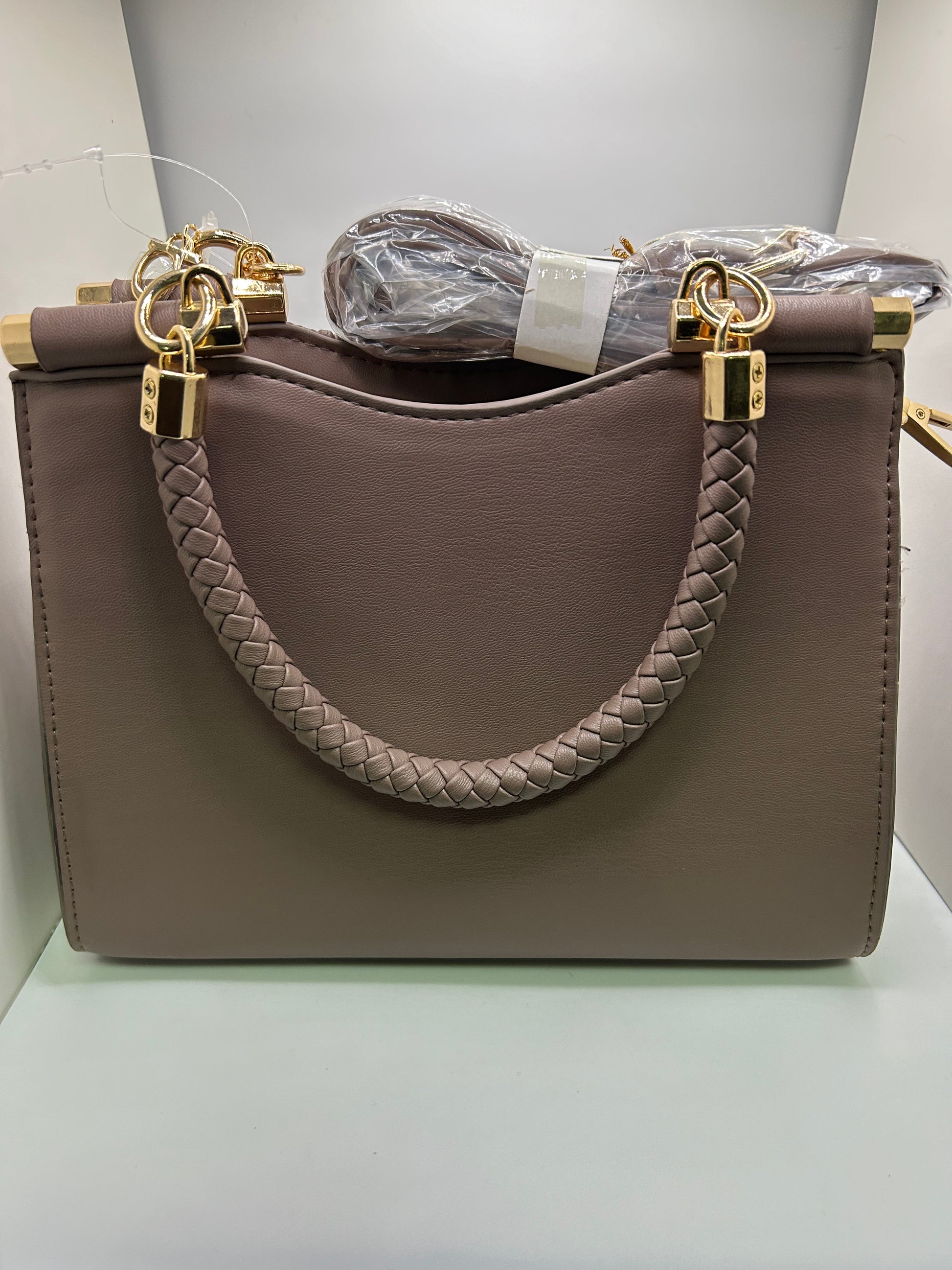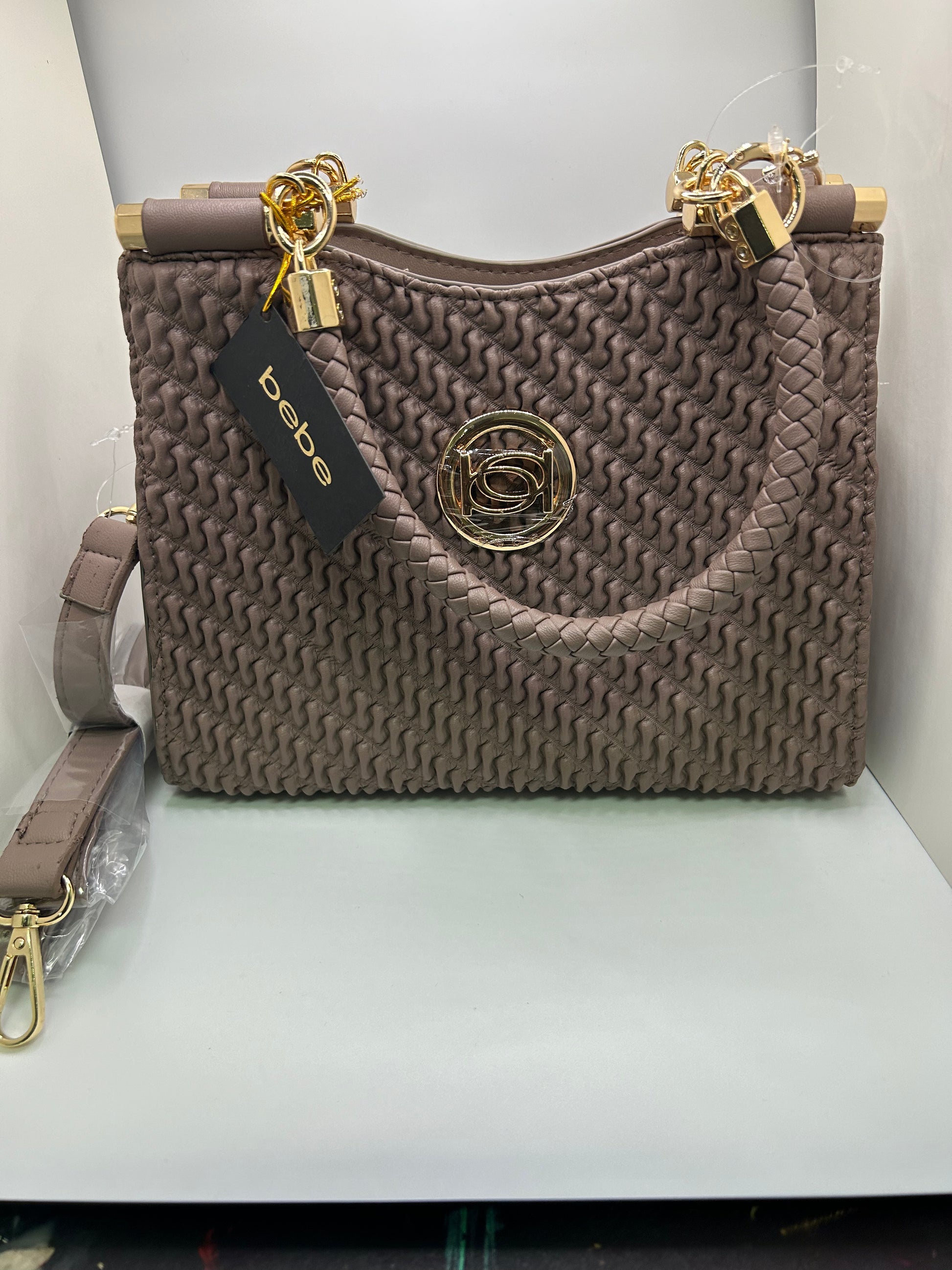 New Bebe fashion bag with detachable shoulder strap and logo keychain. Color- mushroom