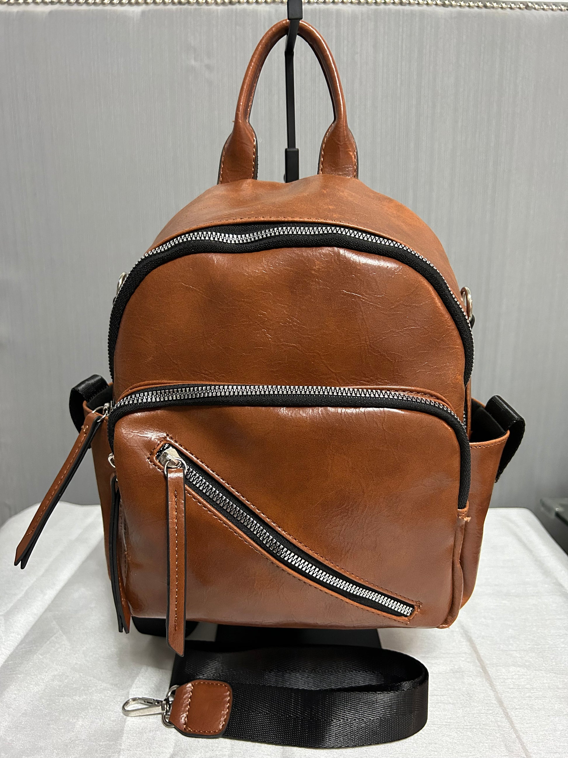 Like new brown vegan leather backpack. Multi pocket, spacious interior, removable strap, converts to hand held, shoulder or backpack carrier. In excellent condition. Please view all photos